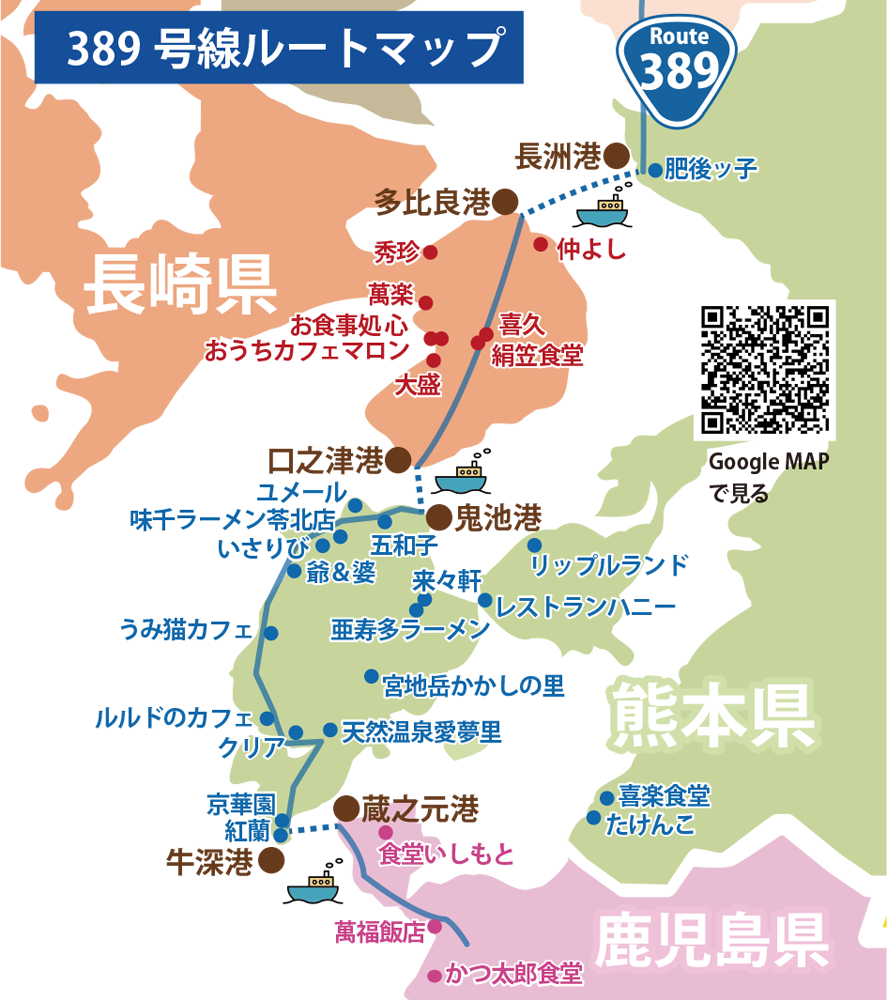 389号線は大牟田市を起点とし、長崎・熊本・鹿児島をつなぐ国道で、「海上国道」と呼ばれるフェリーで結ばれる区間もあります。風光明媚な389号線添いには、知る人ぞ知るちゃんぽんの名店がずらり。